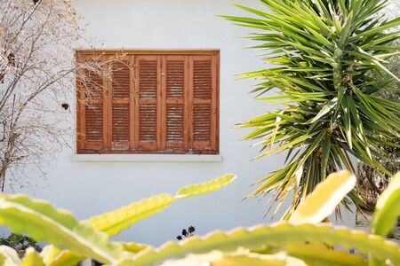 Bright green young palm tree grows near the windows of the house.