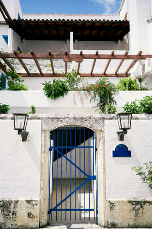 Stone fence with lattice gates near the house with a large balcony and greenery