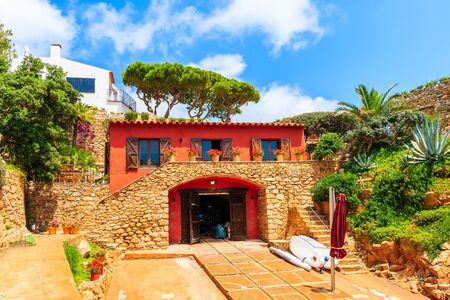 Dock for fishing boats and red house in Cala Fornells bay, Costa Brava, Catalonia, Spain