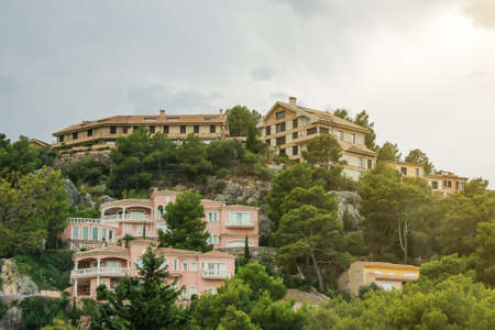 Vacation home and real estate concept. Villas in coastal town in mountains