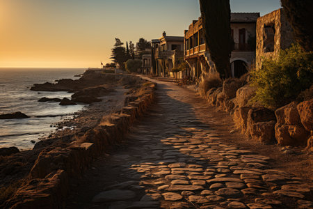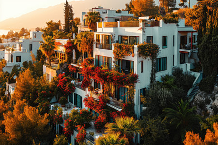 High angle view of Spanish village rooftops with terracotta tiles. Picturesque coastal setting, traditional architecture with whitewashed buildings and plants at golden hour sunset AI Generative AI generated