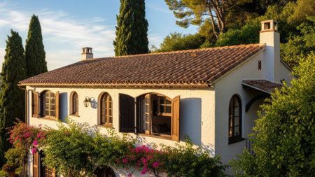 An inviting house features a white exterior, a terracotta tiled roof, and arched windows with shutters. The image showcases the building amidst dense greenery, suggesting a natural environment. The scene is bathed in sunlight, suggesting a pleasant daytime setting. This image is suitable for architectural, travel, or real estate related projects.