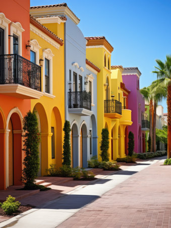 A row of vividly colored buildings with palm trees in front of them under a clear blue sky.