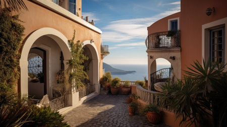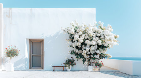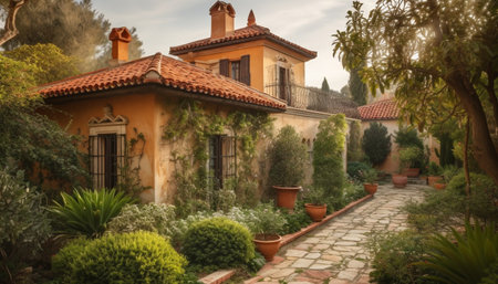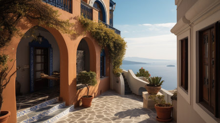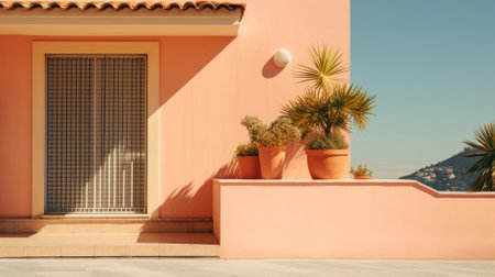 Mediterranean house exterior with potted plants in sunlight, AI generated