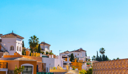 beautiful, picturesque street, narrow road, white facades of buildings, Spanish architecture, sunny day