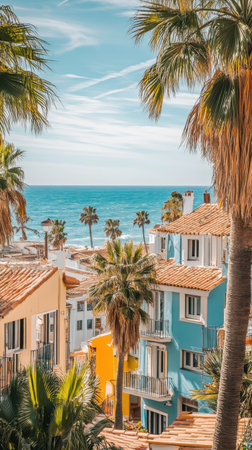A vibrant street showcases charming buildings in hues of orange and blue, framed by palm trees, leading down to a sparkling Mediterranean sea under a clear sky.