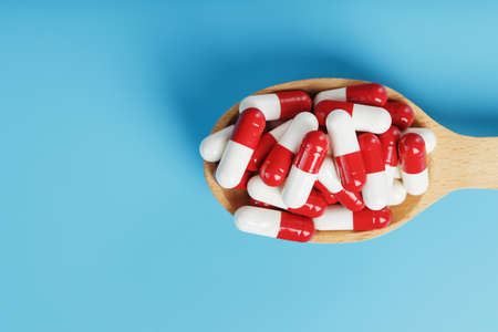 A handful of Red and white pill capsules in a wooden spoon on a blue background. Close-up of Free space Top view