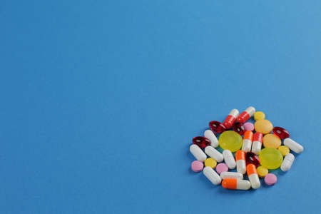 Spilled colored medications and pills on a blue background. Pharmacology and medicine struggle for health. Drug addiction. Treatment of various diseases