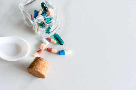 Pouring pills and capsules on a white background close-up. Top view with copy space. Medicine concept
