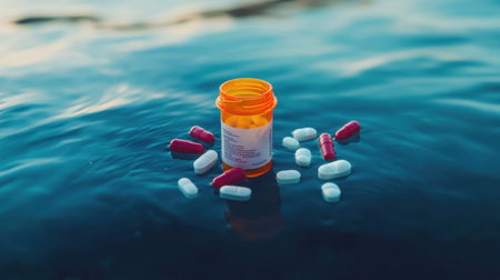 A vibrant sunset reflects on water beside a glass of pills, showcasing themes of wellness and tranquility. Ideal for health and lifestyle concepts.