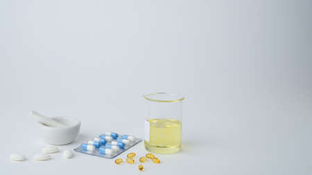 medicine and laboratory glassware for pharmacy and scientific content .