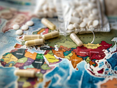 Global Pharmaceutical Industry and Medicinal Products - Colored Pills or Capsules Scattered on Blue Background