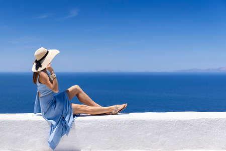 back view of woman in hat looking at sea, summer vacation. Generative Ai