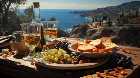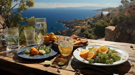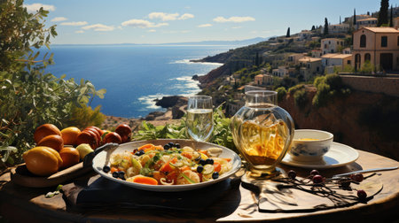 A sumptuous Mediterranean meal laid out on a rustic wooden table overlooking the sea