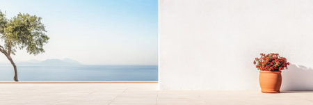 An outdoor Mediterranean patio with a terracotta pot filled with vibrant red flowers. The peaceful setting features a scenic view of the sea and distant mountains. The white walls and minimalistic decor emphasize the natural beauty of the surroundings.