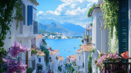 Explore a picturesque coastal pathway leading to a vibrant blue sea. Nestled between charming stone buildings and lush greenery, this scene captures the essence of Mediterranean tranquility.