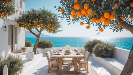 A Scenic Mediterranean Breakfast Spread Featuring Fresh Ingredients, Traditional Dishes, and Refreshing Beverages Overlooking a Tranquil Seascape