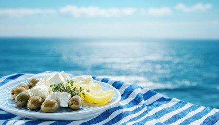 Delicious greek salad with feta cheese, olives, lemon and thyme served on a plate by the sea