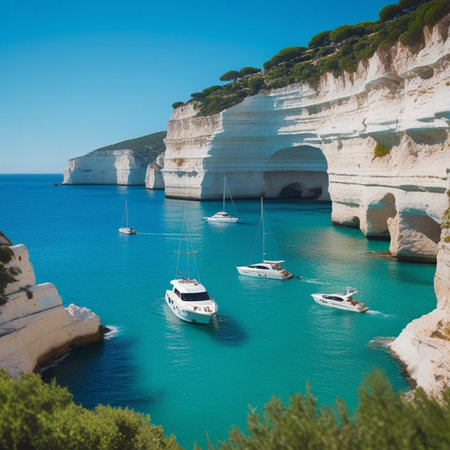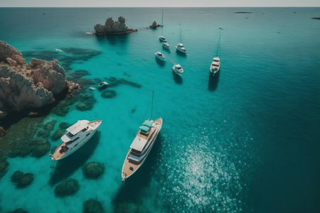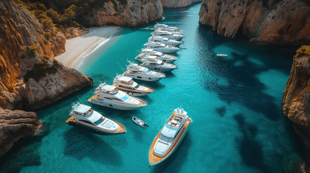 Modern yachts in azure sea bay aerial view image, ai generated. Inspiring sea journey to cliffs by motorboats photography scene wallpaper. Luxury vacation at exotic resort concept photorealistic photo