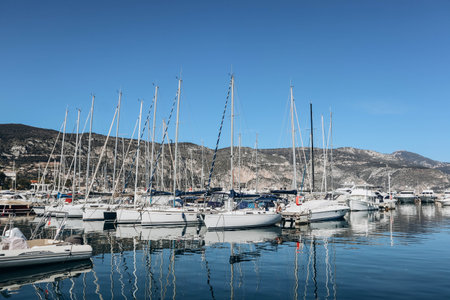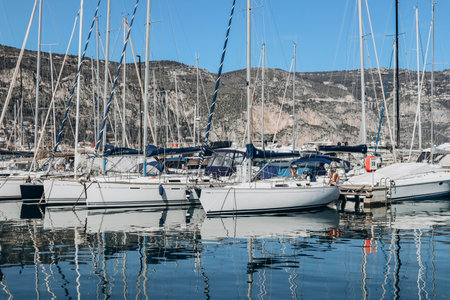 Saint-Jean-Cap-Ferrat, France - 18.03.2023: View of the port of the Saint-Jean-Cap-Ferrat peninsula on a March sunny day