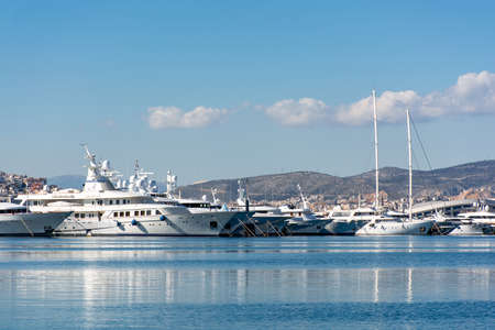 Beautiful yachts on the pier against the blue sky, Athens embankment