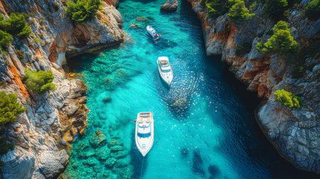 Stunning aerial view of luxury boats floating in vibrant turquoise water, surrounded by a beautiful coastline. Perfect for travel and adventure themes.