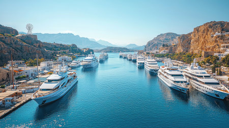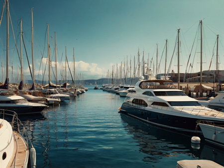 A view of numerous boats floating on the water, creating a picturesque scene under the clear sky, A modern marina filled with gleaming yachts in the summer, AI Generated