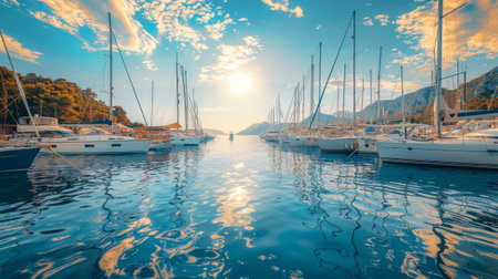 A breathtaking view of a harbor at sunset, featuring an array of sailboats peacefully moored. The calm water beautifully reflects the vibrant colors of the sky as the sun sets behind distant hills, creating a serene atmosphere ideal for relaxation and exploration.