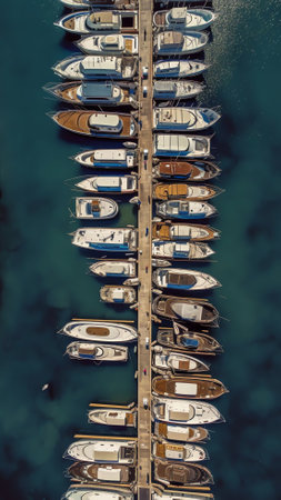 Top view of luxury yachts in the harbor, aerial shoot with drone. Concept of tourism and recreation