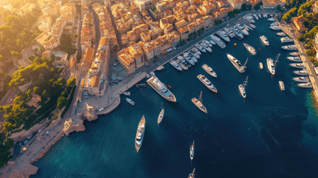 Top view of a coastal city with a beautiful harbor, yachts docked along the marina, and a blend of modern and traditional buildings.