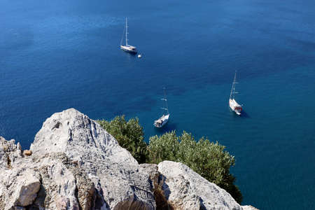 Defocused view from the top of a mountain to blue sea with sailing yachts, focus on a rock. Summer travel and holidays