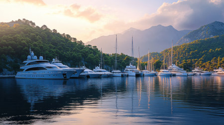 A group of stylish yachts rests peacefully in a calm marina, surrounded by lush forests and towering mountains, illuminated by gentle evening light reflecting on the water.