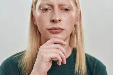 Closeup dissatisfied female model thinking on grey background. Portrait displeased woman looking camera. Serious lady posing indoors. Pensive unhappy girl standing in studio. Thoughtful girl face