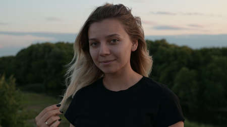 portrait of a beautiful European girl with loose hair against the background of nature. selective focus