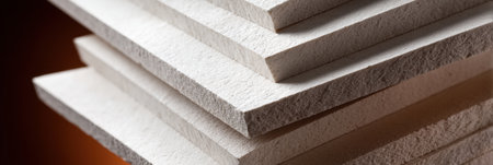 A stack of waterproof gypsum boards is positioned at an angle, illuminated by soft lighting that highlights the unique texture and quality of the material.