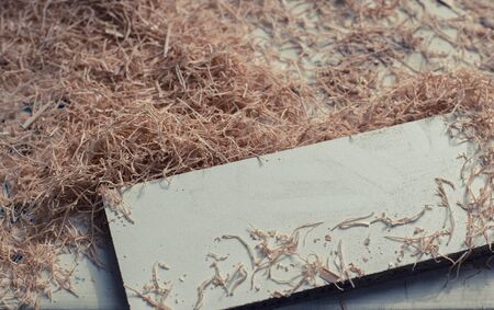 close-up details of the plywood surface overlap the wood chips. The background with the copy space