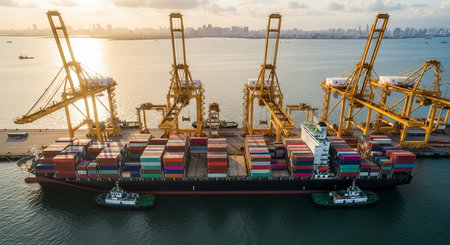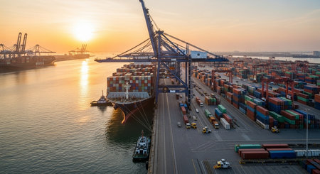 A large cargo ship sits alongside a bustling industrial port, surrounded by towering cranes and vibrant containers against a dynamic sky.