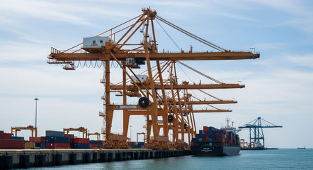 A striking industrial port scene featuring towering yellow cranes and container ships against a backdrop of dramatic, cloudy skies. The image captures the essence of maritime logistics and transportation, showcasing the busy waterfront and the scale of modern shipping operations.