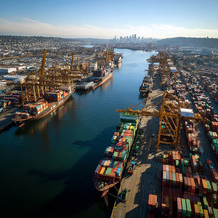 Aerial view of a busy cargo port with container ships and cranes, highlighting global trade and logistics.