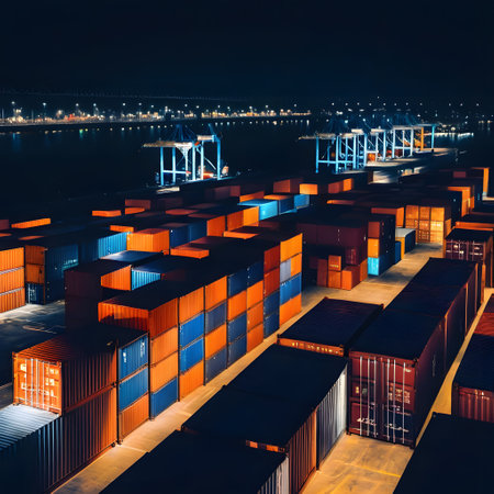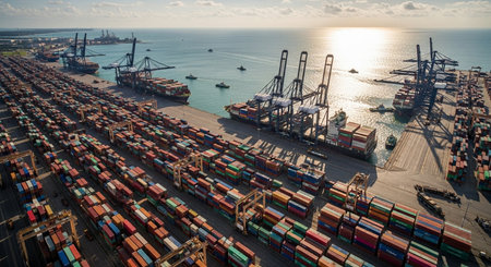 A vibrant aerial view of a busy shipping port with towering cranes and stacked cargo containers, illustrating the scale and complexity of international trade and maritime logistics.