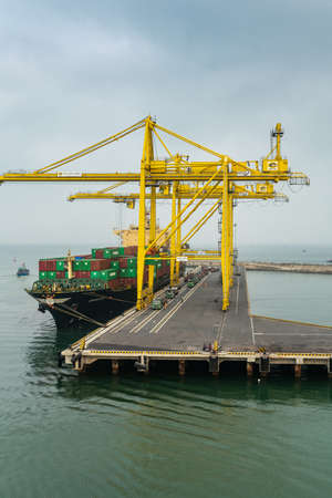 Container Cargo freight ship with working crane bridge in shipyard for Logistic Import Export background