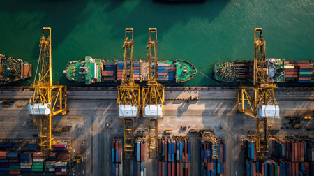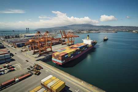 An aerial perspective capturing a vibrant container ship docked in a busy port, showcasing colorful containers, overhead cranes, and tranquil water.