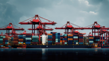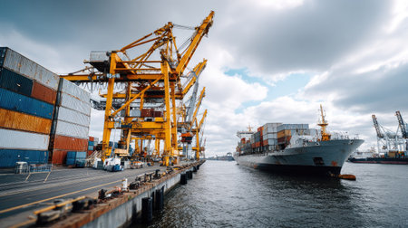 Container ship at a busy port under a dramatic cloudy sky. Cargo handling and shipping in a modern seaport. Global trade and logistics concept.