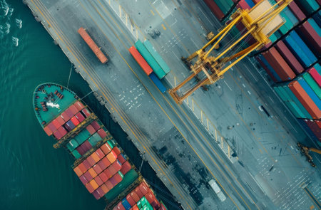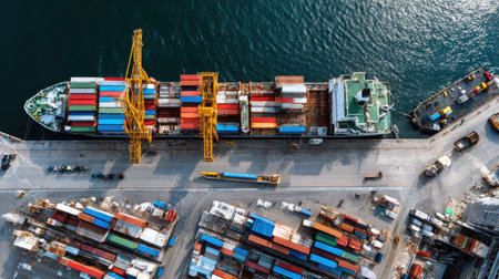An aerial view captures a cargo ship docked at a bustling container terminal, showcasing a vibrant array of shipping containers and logistics operations.