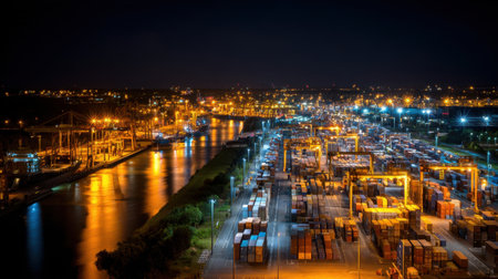 A striking night scene captures a vibrant shipping port illuminated by thousands of lights, showcasing cranes and stacked containers along the tranquil waters.