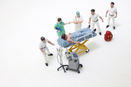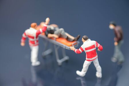 Miniature people : Injured man lying on the first aid bed and there are emergency medical staff dragging a first aid bed. Man who wear brown jacket follow his friend. Emergency, life insurance concept