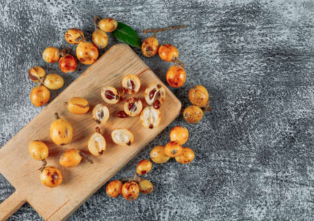 Top view loquats on cutting board on gray textured background. horizontal space for text