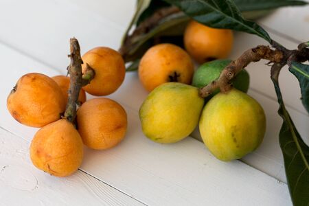 fresh loquats on white wooden background
