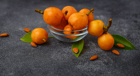 Top view loquats in bowl with leaves on dark textured background. horizontal
