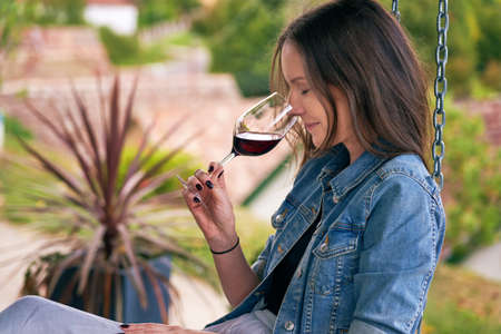 Close up image of woman drinking red wine with eyes closed in the vineyard.